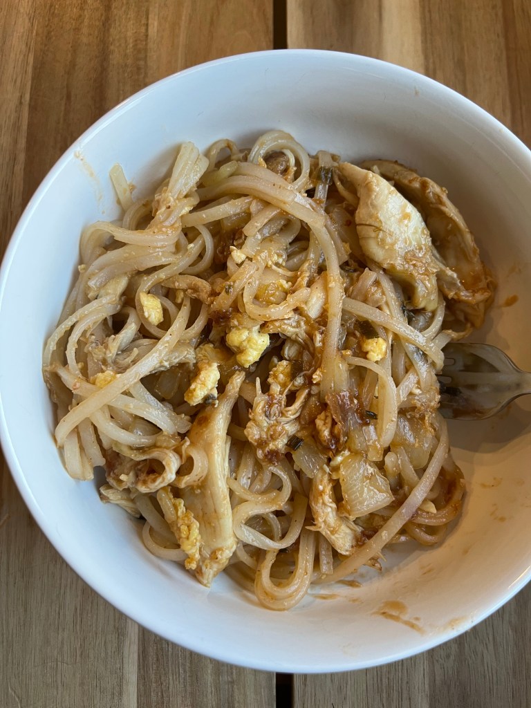 - Add in cooked chicken, cooked noodles, and sauce to pan with onions and egg. Stir to combine and heat over low for 2 minutes to allow the sauce to cook into the noodles.