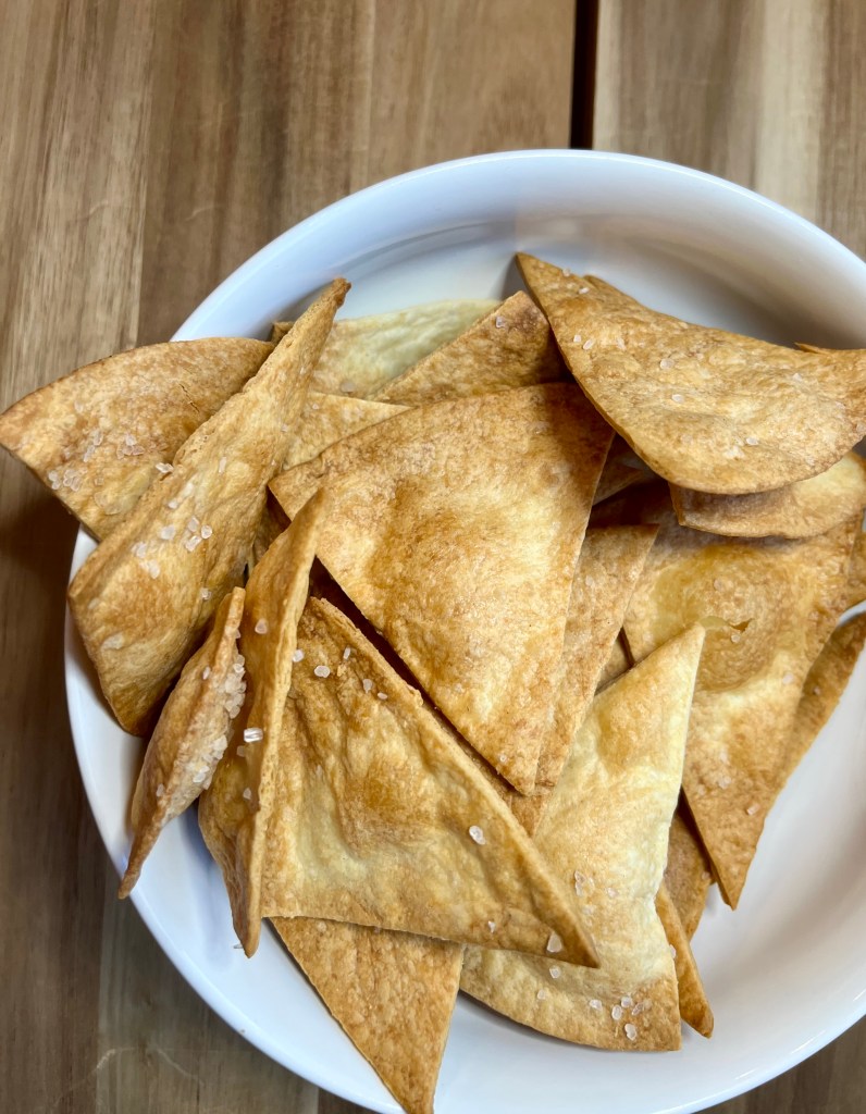 I have a bad habit of always buying way too many tortillas. H-E-B makes tortillas fresh in house so I always buy them, and they come in a 20 pack, which Steven and I could never finish before they go bad. Last night we decided to use the extras to make tortilla chips, and it was surprisingly easy! Plus great portion control because you have a limited number instead of the whole family size bag of Tostitos! You only need 3 ingredients!