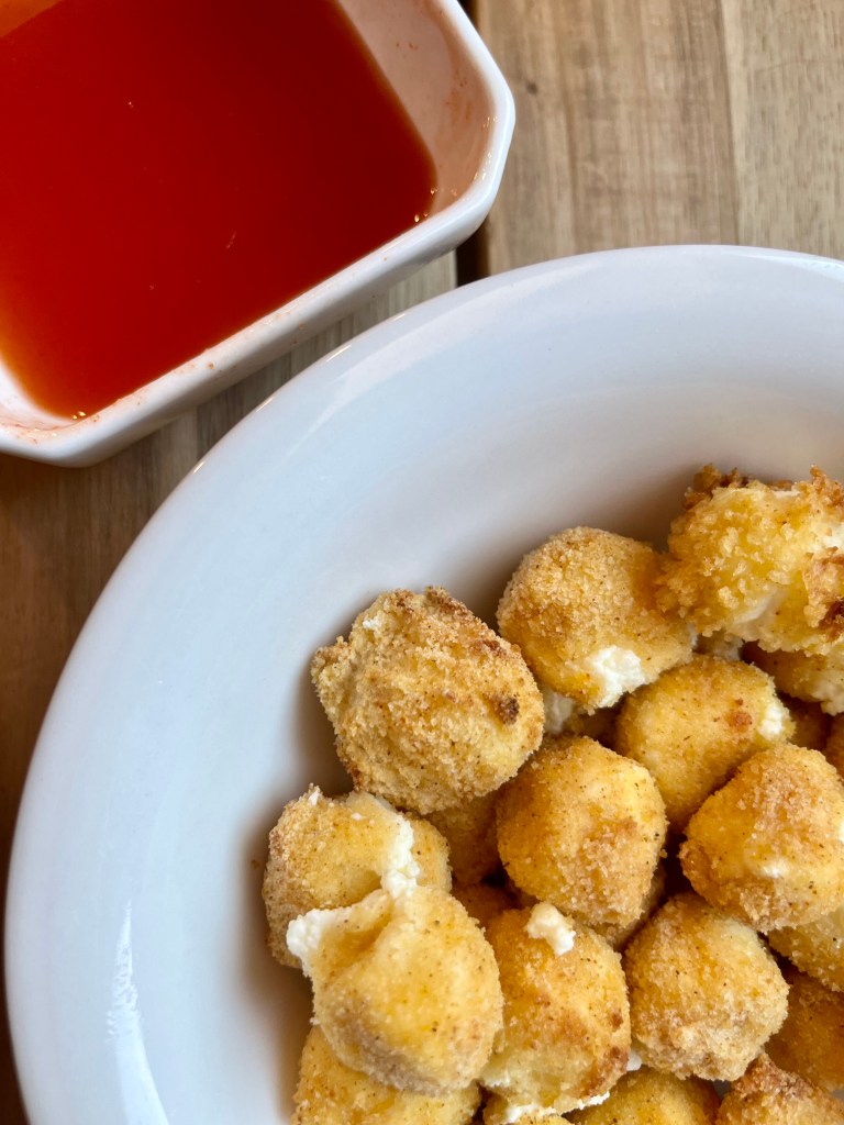In college, we went to this restaurant that had cheese curds, and I loved them. I haven’t eaten them in years, but this week when I was trying to decide on an air fryer recipe to make, they came to mind. Listen…. these are vastly different than The Keg’s deep fried cheese curds, but they are delicious nonetheless. I used goat cheese, but really you could use any soft cheese you like. Some examples would be feta, brie, cream cheese… Anyway, enough talking, here’s the recipe!