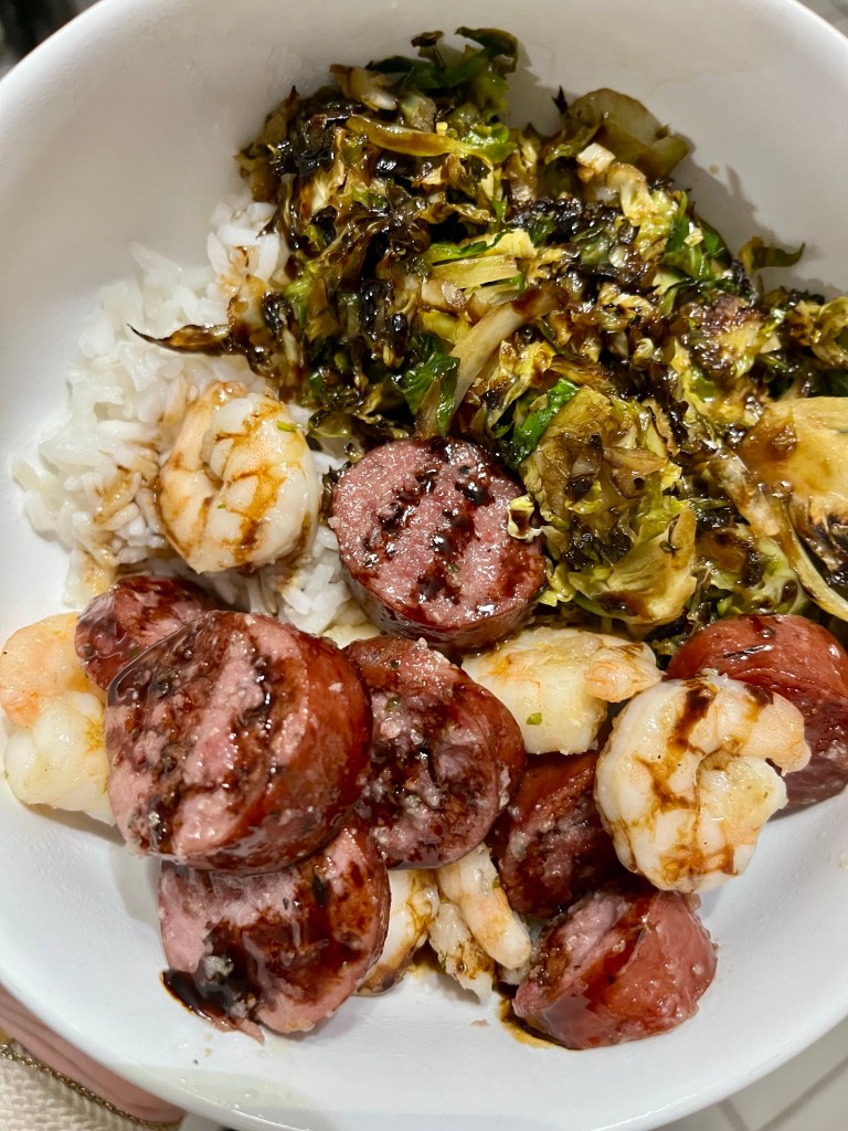 - Assemble bowls: rice, Brussels, shrimp and sausage, and top with some extra balsamic glaze. Enjoy!