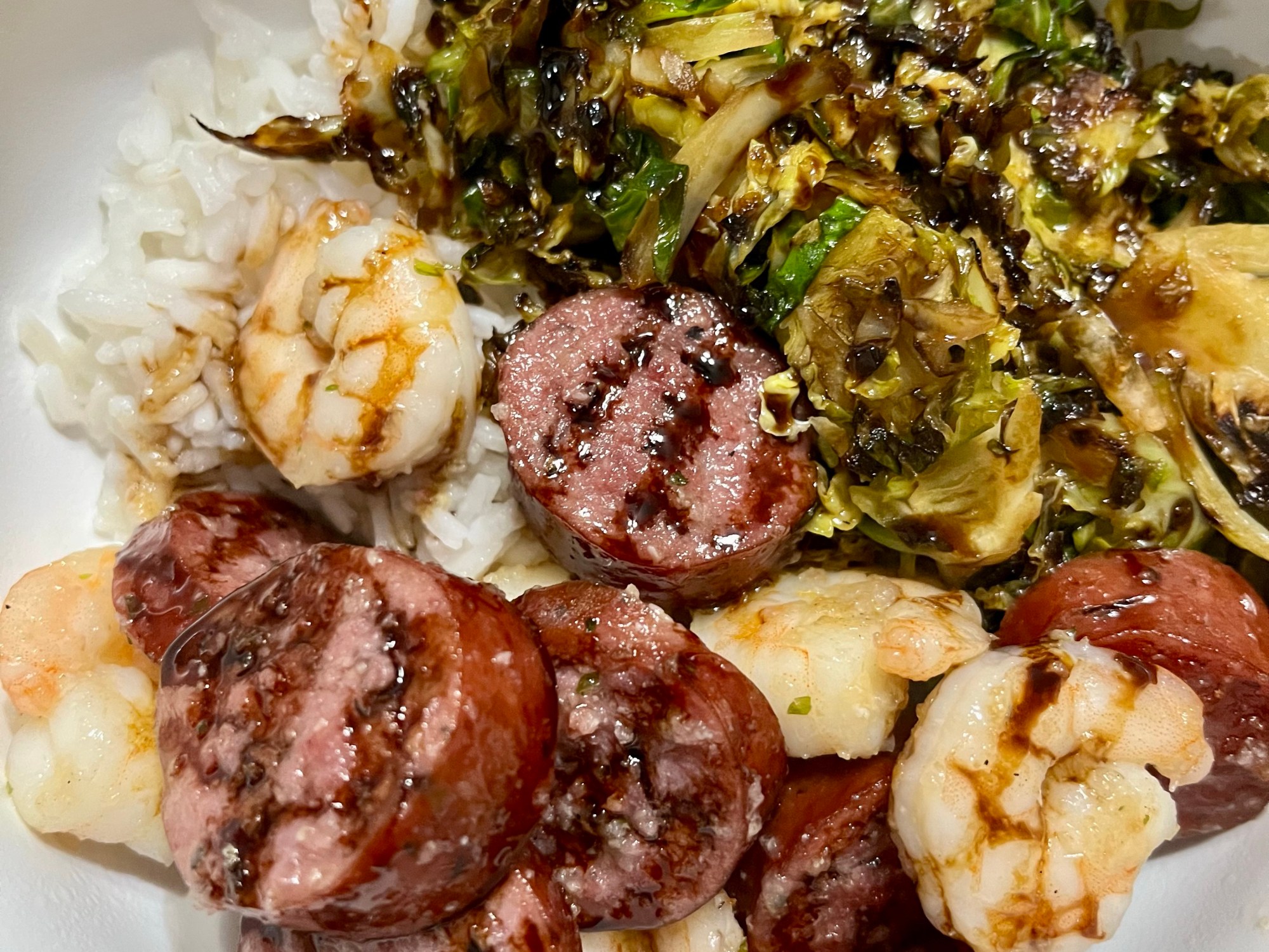 - Assemble bowls: rice, Brussels, shrimp and sausage, and top with some extra balsamic glaze. Enjoy!