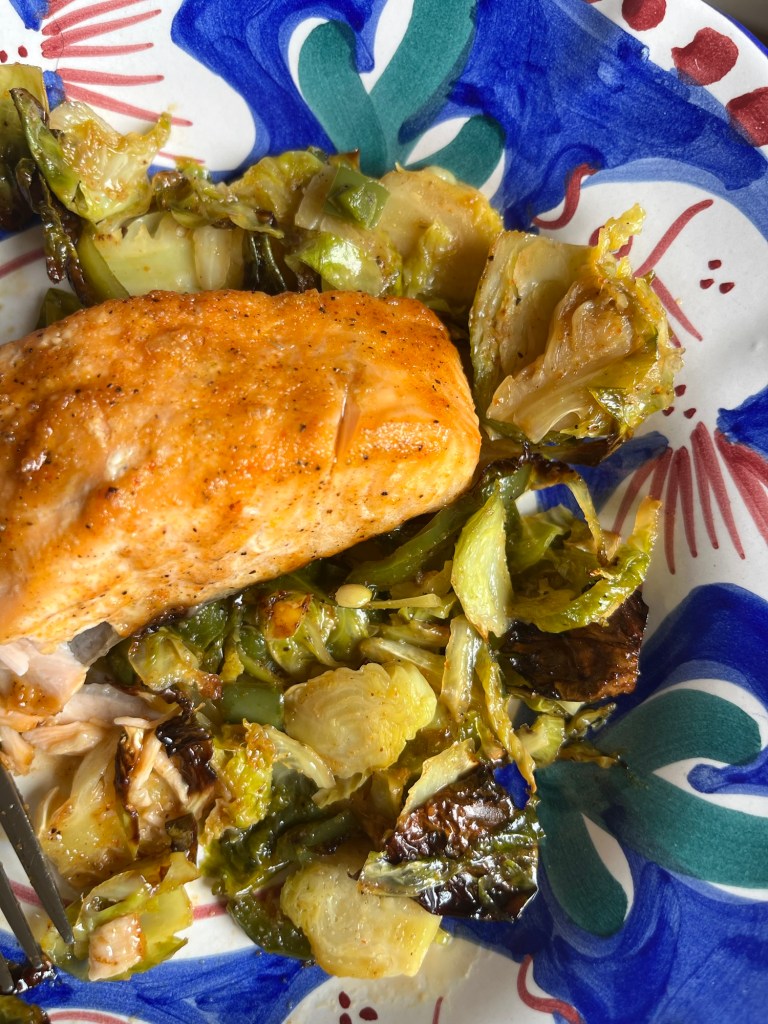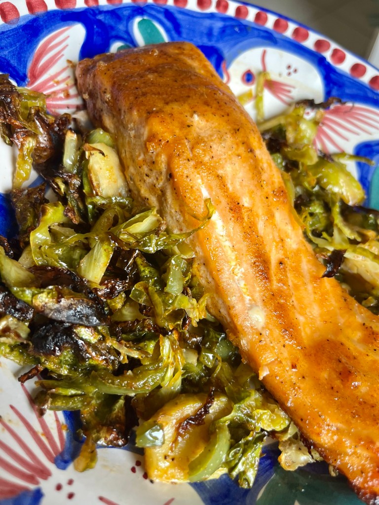 - Either toss the salmon in it or baste the mixture onto the salmon. Let it marinate while you prep the Brussels.